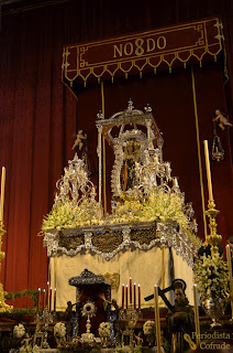 Las dificultades para caminar junto a la Hiniesta por Sierpes ya eran más que evidentes cuando a la estrechez propia de la calle se unió, en la fachada del Círculo Mercantil, la generada por el altar que para la procesión del Corpus instaló la Hermandad del Rosario de Mairena del Aljarafe, protagonista de una exposición que ha podido verse estos días en dicho lugar y que próximamente analizaremos con detalle en este blog.
