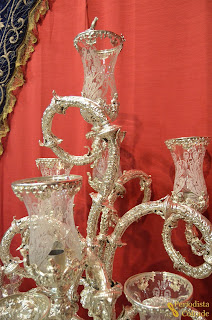 Seguimos con el respiradero frontal que sustituyó al anterior y que hoy se sigue utilizando para el paso de la Hiniesta Gloriosa en el Corpus. Conjuga el metal plateado, de Orfebrería Villarreal, con la malla de oro bordada en oro, plata y sedas de colores, de Carrasquilla (1967). También se ven aquí dos candeleros de alpaca plateada, de Manuel de los Ríos (1979); el llamador de metal plateado que pudiera ser de Manuel Seco (1955); el basamento de un candelabro de cola, de metal plateado (Manuel Seco, 1952); y dos jarras de metal plateado del mismo autor, de 1947.