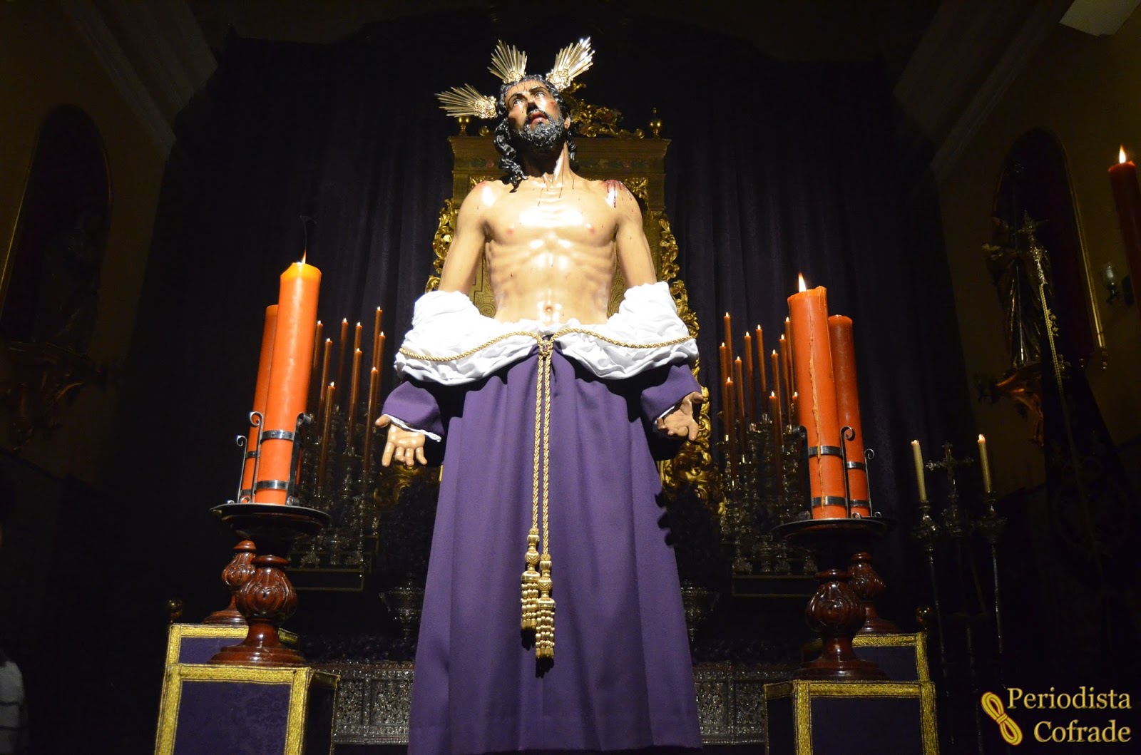 La talla de Jesús Despojado estaba situada ante el retablo de la capilla, tapado por un enorme cortinaje morado. Rodeaban al Señor los cuatro hachones color tiniebla que lleva en sus andas del vía crucis. Se elevaba sobre una pequeña peana plateada, colocada a su vez sobre una estructura que delante tenía el respiradero frontal del paso de palio de la Virgen de los Dolores y Misericordia.