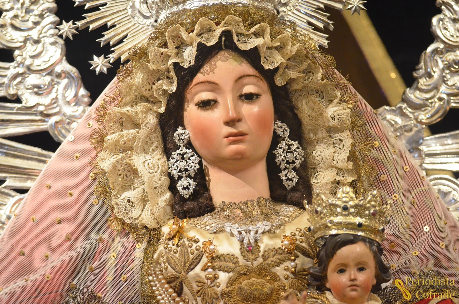 La talla atribuida a José Montes de Oca contaba también con ráfaga, corona y media luna plateadas, además de lucir unos llamativos pendientes, un rosario en la mano izquierda, varios collares sobre el pecherín, donde también había un ramillete de azucenas de orfebrería y algunas medallas.
