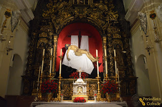 Así, con María Santísima de la Caridad en su altar habitual en el lado derecho del pequeño templo del Arenal, el altar del retablo mayor cuenta únicamente con la presencia del Señor que tallara Luis Ortega Bru en 1950. Bajo la imagen, ocultando la estructura que la sujeta, hay un lienzo blanco, mientras que detrás se encuentra la cruz que habitualmente está ubicada en dicho lugar, con sendos sudarios colgando de sus brazos.
