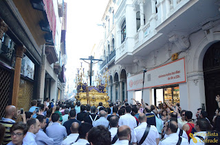 Sevilla lo sabía y los turistas quizá no, pero no tardaron en enterarse y en participar asistiendo a esta salida extraordinaria fijándose en cada detalle y atendiendo a cada explicación. "Es que cumple 400 años"; "no salía desde 1915" (en un paso, porque sí ha presidido vía crucis externos); "era de la Lanzada pero ya no"; "el paso es de San Bernardo"... A lo largo del itinerario se podían escuchar todo tipo de explicaciones de unos a otros para que pudieran comprender mejor lo que estaban contemplando: un Cristo en la calle a treinta y muchos grados de temperatura.