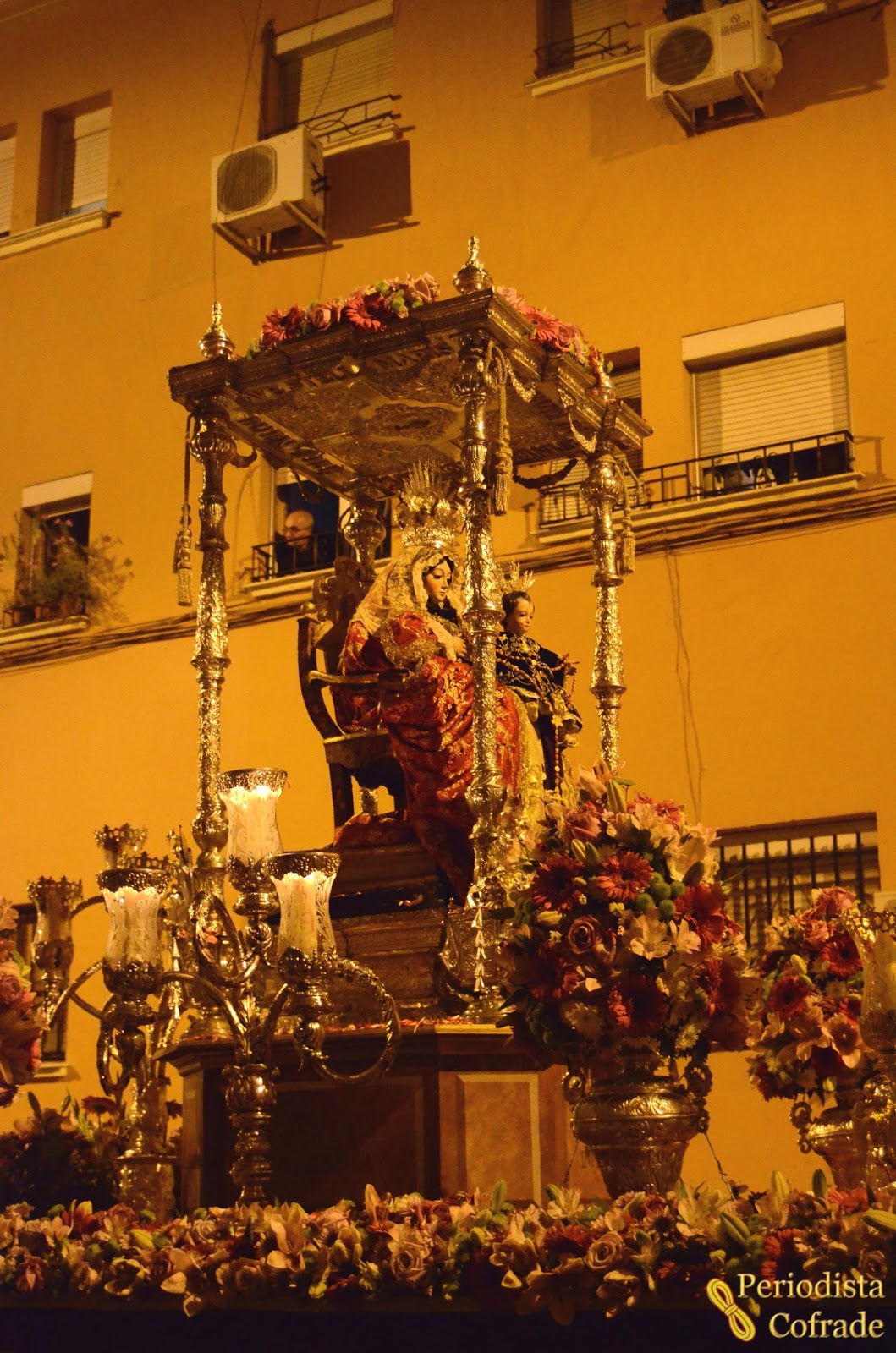 La salida se produjo a las ocho menos cuarto de la tarde, saliendo desde el templo únicamente la Virgen en su templete de plata, estando el paso esperando en la calle debido a las conocidas dimensiones de la parroquia. Una cruz alzada con manguilla entre ciriales daba inicio al cortejo, seguida del estandarte corporativo y el cuerpo de acólitos.