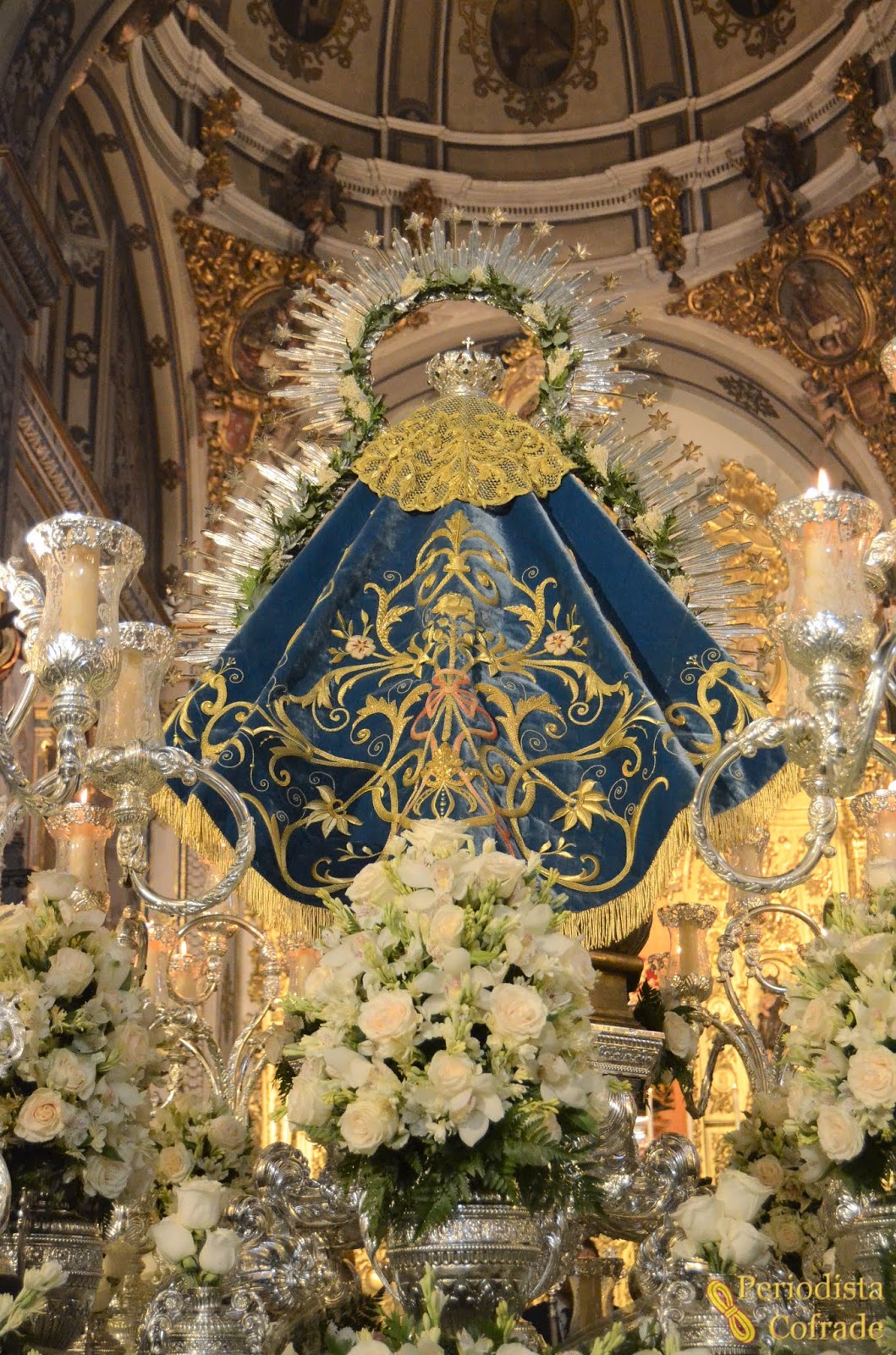 La Virgen de la Cabeza vestía nuevamente el conjunto de manto azul y saya blanca, ambos bordados en oro, que el Taller de Santa Clara confeccionó en 2016 para la salida extraordinaria de la imagen con motivo de presidir el Pregón de las Glorias de aquel año. Hay que destacar también que, entre los numerosos broches y medallas que llevaba la imagen, una era de la Esperanza de Triana por su sexto centenario.