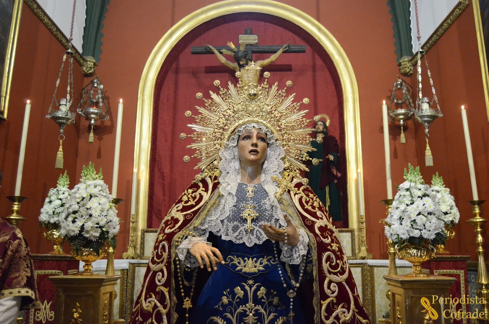 Finalmente, al fondo de la capilla había cuatro blandones dorados en los laterales y dos candeleros ante el crucificado, todos ellos con velas blancas de gas.