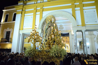 De esta forma, en silencio, la Virgen del Rosario salió del templo conventual de las Comendadoras del Espíritu Santo vestida tal cual fue el día 18, con manto de terciopelo negro y saya blanca de tisú, aunque ahora no llevaba la toca de sobremanto que sí tenía a la ida.