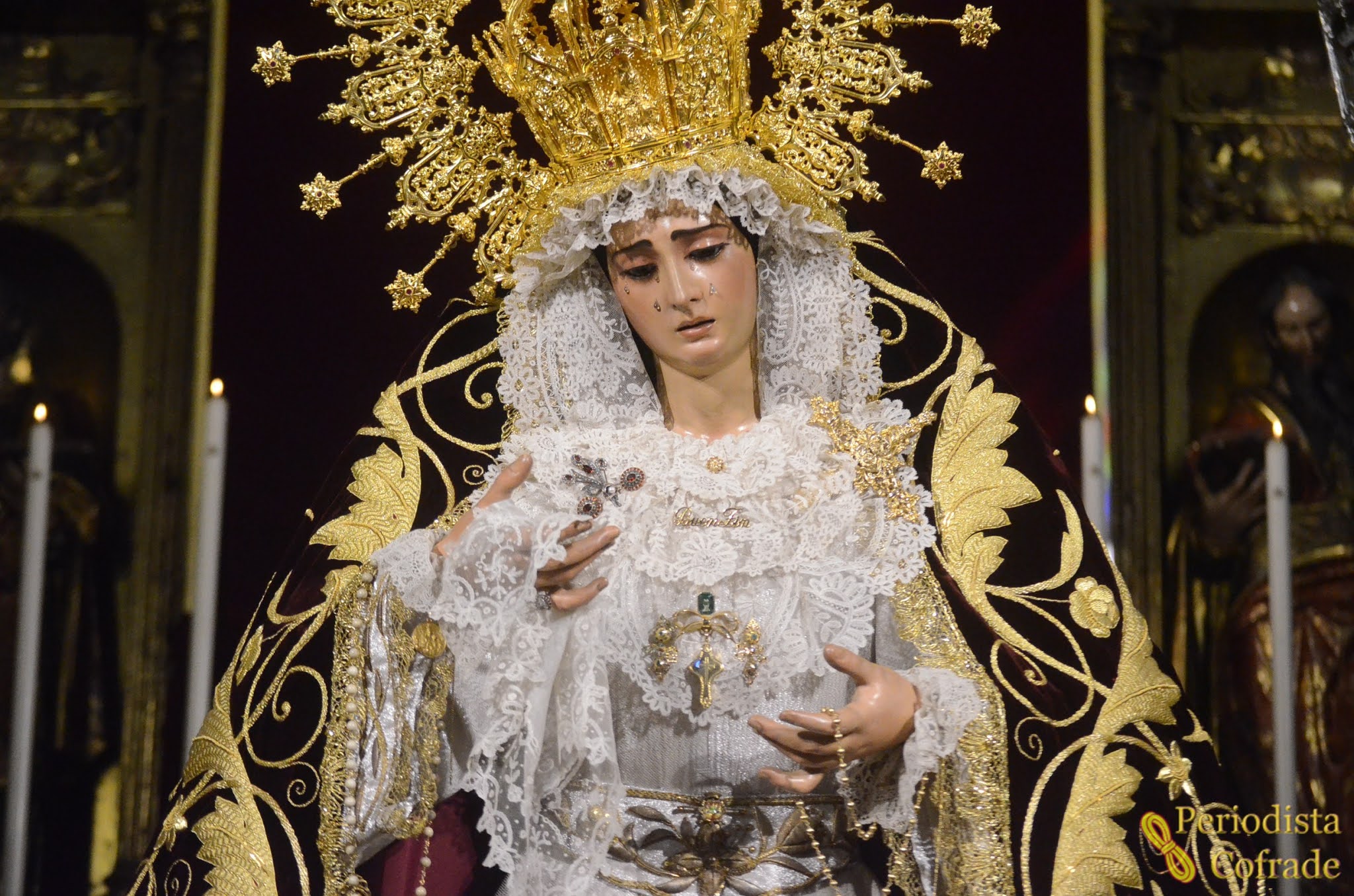 Ante sí, tenía varios candeleros, jarras del paso de palio con calas moradas y dos ángeles mancebos con faroles de plata. Y en los laterales, había cuatro blandones dorados y un total de diez candeleros más pequeños, todo ello con cirios blancos.