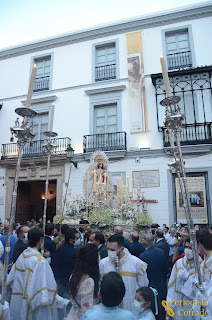 Con la dificultad habitual por el reducido tamaño de la puerta, los costaleros lograron sacar el paso a la calle al tiempo que caían pétalos sobre la imagen, cuya ráfaga debe ser plegada en su parte superior para poder cruzar el dintel.
