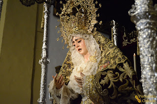 Nuestra Señora de la Encarnación, de la Hermandad de San Benito, estuvo el pasado viernes expuesta a la veneración en el altar mayor de la parroquia con motivo de XXVII aniversario de su Coronación Canónica. La dolorosa, que hace dos años, poco antes del inicio de la pandemia, realizaba una salida extraordinaria por los 25 años (ver), fue ubicada sobre su peana procesional y bajo el palio con sus doce varales, los antiguos respiraderos laterales y las jarras, que portaban rosas y calas blancas, flores que estaban también en otros puntos del montaje.