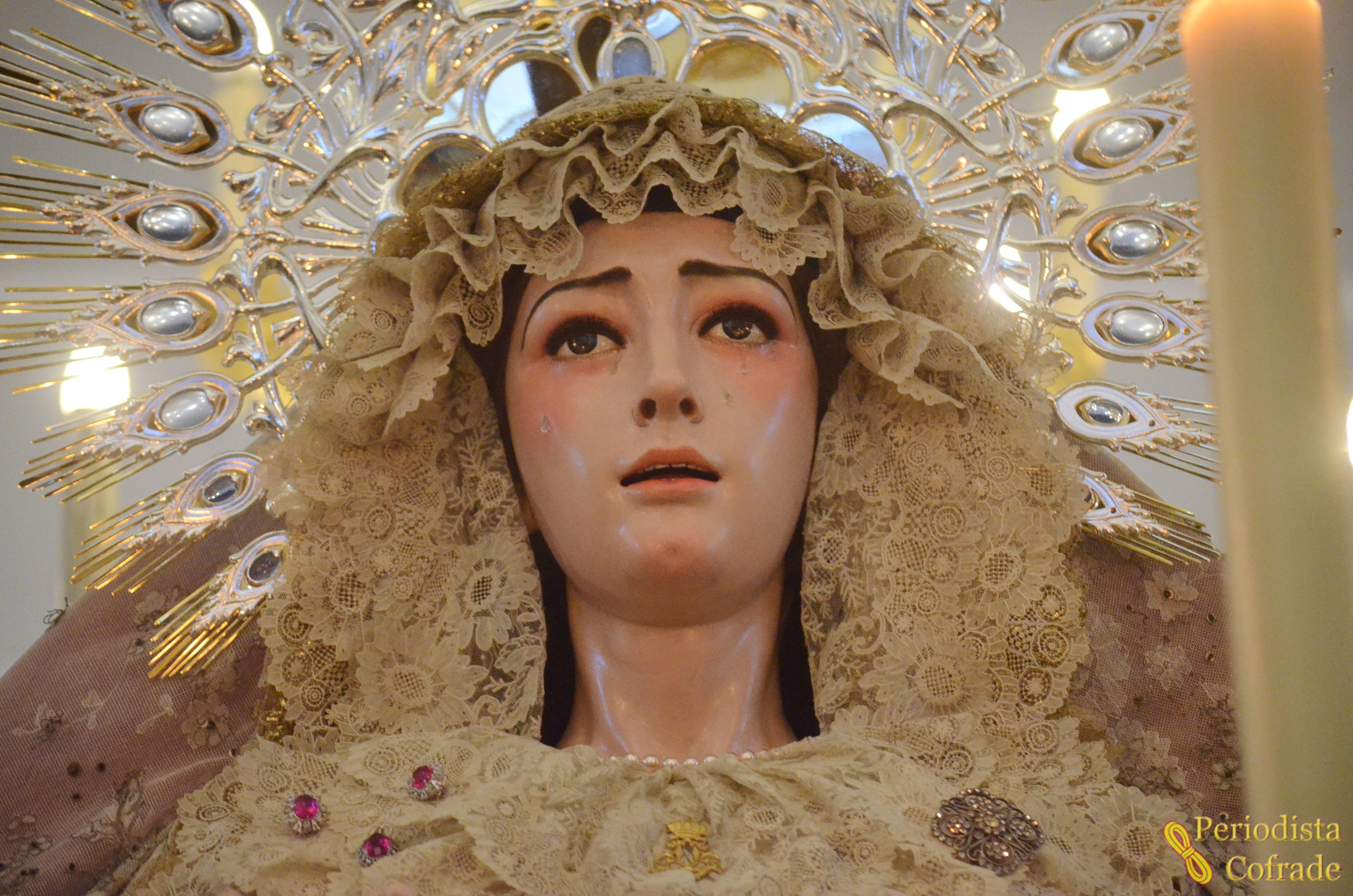 Sin embargo, aunque el cielo aún amenazaba con descargar, pareció dar una tregua que la junta de gobierno aprovechó para decidir salir para rezar el rosario por las calles. La Virgen estaba perfectamente preparada. Estrenaba un manto liso de color malva y lucía una saya blanca, una toca y la llamativa diadema de Álvaro Abril estrenada el año pasado, siguiendo el estilo del que será el futuro paso de palio. Las andas, cubiertas con unos faldones de damasco blanco, estaban iluminadas con seis candeleros con cera blanca y adornadas con rosas, lisiantum, nardos, calas y sedum.