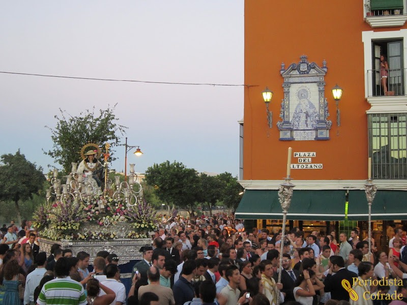 El momento álgido de la procesión estuvo, como es habitual, en la calle Alfarería, adornada para la ocasión con multitud de colgaduras, flores de papel y un arco que sólo se iluminó cuando la Pastora pasó por debajo. A esta zona llegó el paso con “Encarnación Coronada”. Posteriormente, se detuvo ante un nuevo azulejo que fue bendecido y descubierto en ese momento (allí se cantó de nuevo la Salve), situado en la fachada de la casa desde la que, acto seguido, cayó una torrencial lluvia de pétalos mientras sonaba, como el año pasado, “Esperanza de Triana Coronada”. Parecía no caber ni un solo pétalo más en ese monte que, desde ahí y hasta el final de la procesión, fue repartiendo flores y aromas con cada levantá.