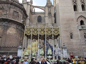 Superadas las obras y las estrecheces, el palio de las Angustias alcanzó la Plaza Virgen de los Reyes y buscó la Puerta de los Palos, por la que accedió a la Catedral a eso de las cinco menos cuarto de la tarde, mientras las campanas de la Giralda la recibían con gran revuelo.