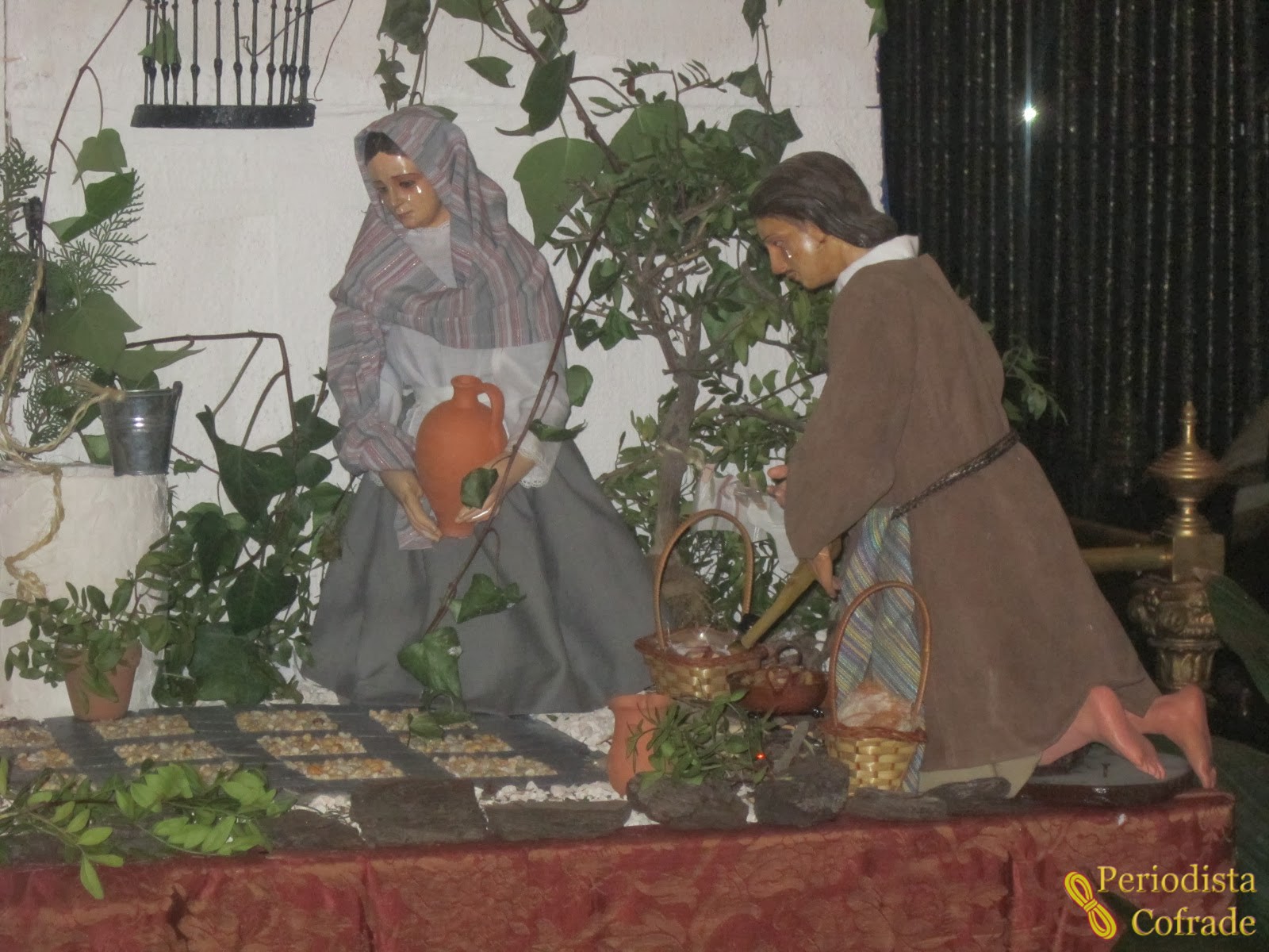 Además, tanto el fondo del belén como el suelo se inspiraban en el patio del antiguo convento, situado entre la puerta de acceso de la calle Bustos Tavera y la propia puerta de la iglesia. Entre dos pequeños faroles se veía, a la derecha, el escudo de la hermandad.