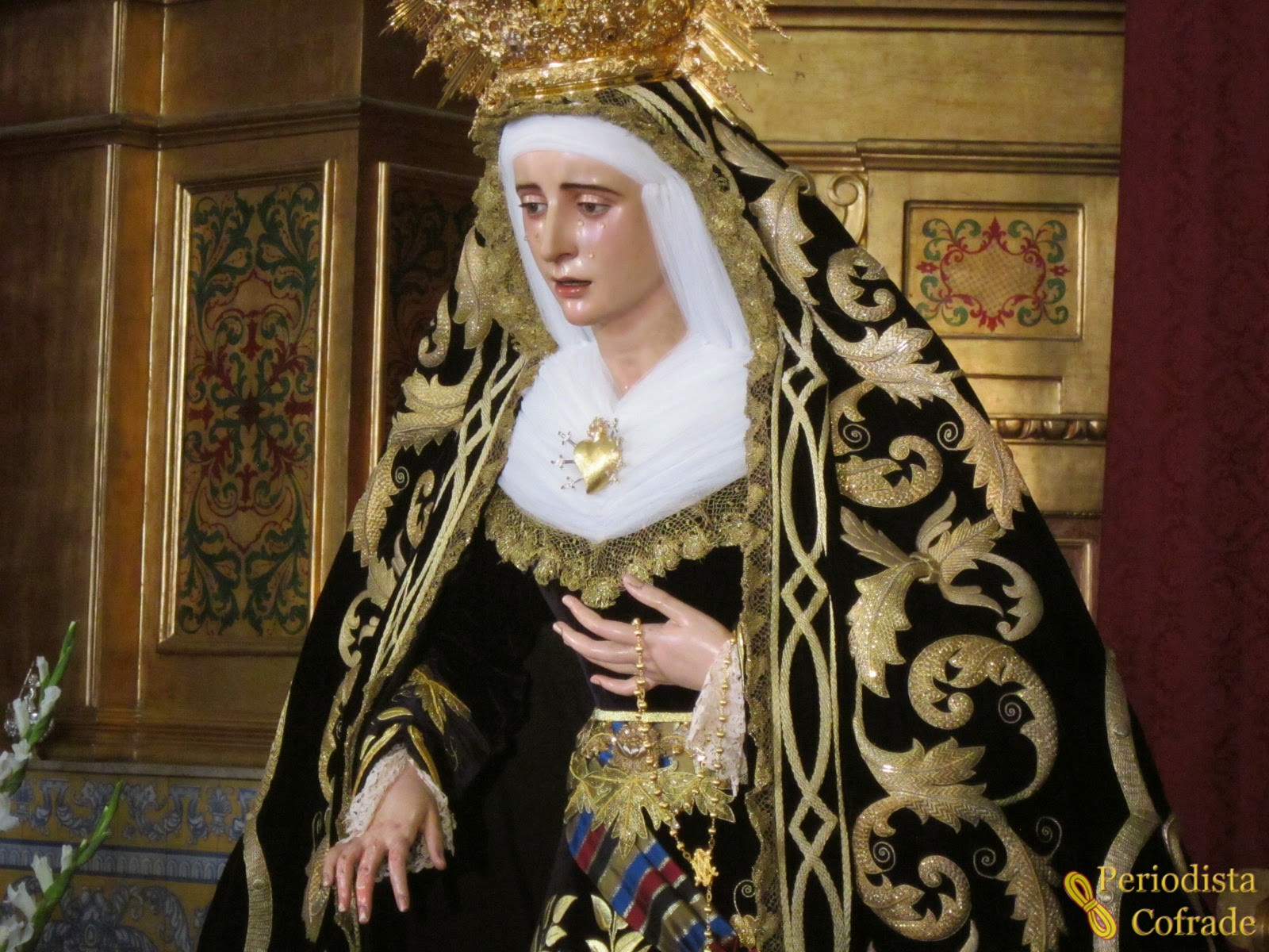 Elevada sobre una peana de madera dorada y ante el dosel de cultos de la Hermandad del Cerro, la dolorosa de Sebastián Santos fue ubicada en el presbiterio de la Parroquia de los Dolores, vestida con el manto de salida y la saya azul, ambas piezas bordadas en oro por quien fuera hermano mayor de la cofradía del Martes Santo, Francisco Carrera Iglesias. Además, lucía la corona de oro de la Coronación Canónica, de los Hermanos Delgado, y sobre el pecherín llevaba únicamente el corazón con los siete puñales, de Joyería Ignacio. En la mano izquierda sostenía un rosario.