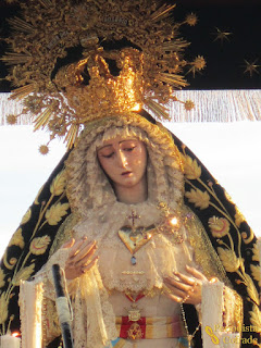 Ya en Reyes Católicos, la Virgen del Rosario siguió buscando el puente en línea recta. Antes de alcanzarlo, el paso, exornado con flores blancas en las jarras laterales y hermosas flores de talco plateadas y doradas en la delantera, se detuvo.