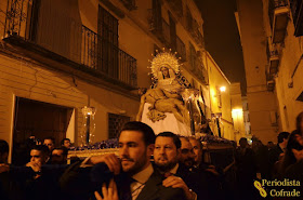 El último tramo de este breve traslado fue la calle Temprado, por la que avanzó hasta la reja que da acceso al recinto del Hospital de la Caridad. La baja altura del remate de dicha reja obligó a los encargados de llevar las andas a bajarlas sujetándolas con los antebrazos y caminando lentamente de lado hasta que la ráfaga de la Virgen de la Piedad pudo sortear el obstáculo.