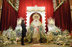 Y ante el cortinaje, se dispuso, recién restaurada, la embocadura del camarín de la Esperanza, obra de Marmolejo, entre credencias de plata, candeleros y jarras del paso de palio con rosas, tulipanes y nardos.