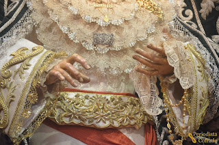 Un buen de candeleros plateados con cera blanca iluminaban el altar, que estaba adornado con diversas flores blancas que también estaban en jarras del paso de palio dispuestas a lo largo del altar, dos de ellas flanqueando a la Virgen sobre sendas columnas de madera dorada. Las flores eran rosas, anthurium, margaritas y antirrhinum.