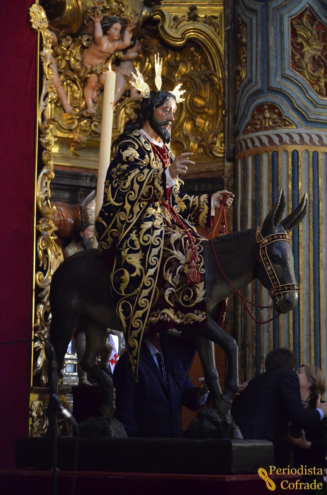 Flanqueaban al Señor de la Sagrada Entrada dos ángeles con filacterias blancas con la cruz de Santiago de color rojo bordada, como las túnicas de sus nazarenos, y con palmas rizadas. Además, había cuatro blandones dorados con altos cirios blancos, dos a cada lado, y una jarra con diversas flores de tonalidades rosas entre cada pareja de blandones. Las mismas flores estaban en un gran centro a los pies del Señor.