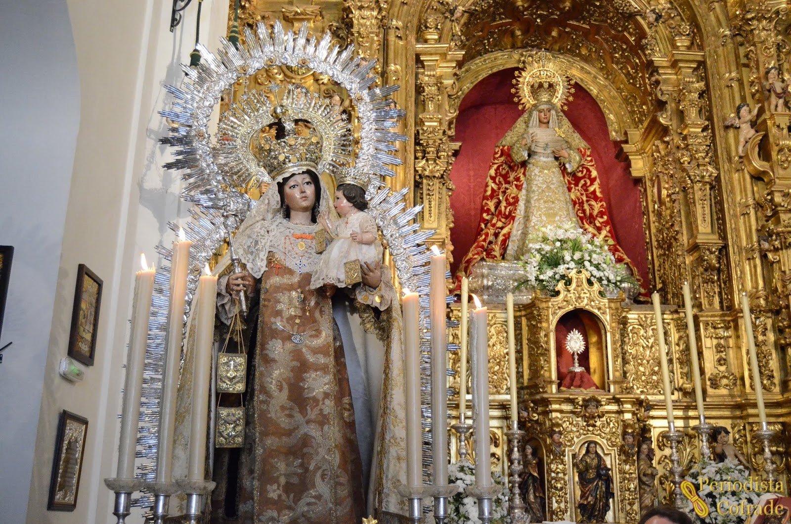 Minutos antes de la una menos cuarto del mediodía se ha iniciado el traslado de vuelta, con la Virgen del Carmen llevada en su mayoría por mujeres hasta la parroquia por Pureza, Vázquez de Leca y Pelay Correa, para entrar en el templo por la puerta situada a los pies, junto a la capilla de la hermandad. Previamente, la Virgen, que vestía manto blanco de brocado, mantilla y saya y escapulario de color marrón claro, ha pasado junto a su retablo cerámico situado en la fachada que da a la calle Vázquez de Leca.