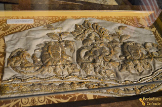 La Hermandad de la Amargura no estrenó en 1919 únicamente su marcha procesional más conseguida, sino también una túnica, conocida como de rocallas, confeccionada por Juan Manuel Rodríguez Ojeda. En la muestra veíamos los bordados del pecho y de una de las mangas de esta pieza que en 1999 sería reproducida por el taller de Santa Bárbara.
