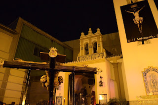 Pasada la Caridad, el Cristo de las Aguas continuó por Temprado hasta su capilla, de cuya torre cuelga una gran foto de la propia imagen con motivo de su 75 aniversario. Antes de entrar, ya en el atrio, los que portaban las andas se dieron la vuelta para que el Cristo entrara mirando hacia la calle.