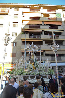 La Virgen se encontró de frente con la portada que representaba la fachada de la Parroquia de la Concepción por el medio siglo de la Hermandad de la Sed. Pero no la cruzó, como sí haría al día siguiente, sino que giró a su derecha para, con "La Estrella Sublime", acercarse lo más posible a la fachada sin terminar del Ayuntamiento.