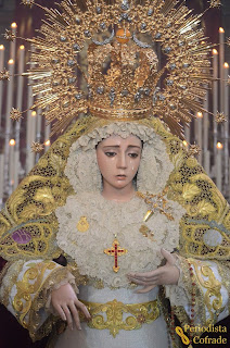 Además, llevaba el manto procesional, de terciopelo burdeos liso, toca de sobremanto bordada sobre malla y la corona que también luce en sus estaciones de penitencia cada Lunes Santo. En el pecherín contaba con una cruz pectoral, un puñal, un broche con una rosa y otro con el escudo de la hermandad en dorado. En cuanto a las manos, tenía la derecha extendida para recibir los besos de los devotos, mientras que con la izquierda sujetaba un rosario de cuentas rojas.