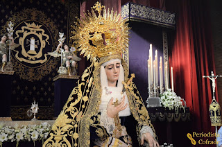 Detrás había otras dos jarras del palio y los cuatro ángeles del antiguo paso del Cristo de la Púrpura, únicos elementos que se conservan de este desconocido paso y que son obra de Pedro Roldán de 1666. Y en los laterales había diferentes candeleros con cera blanca y sendos centros florales junto a bandejas de plata.