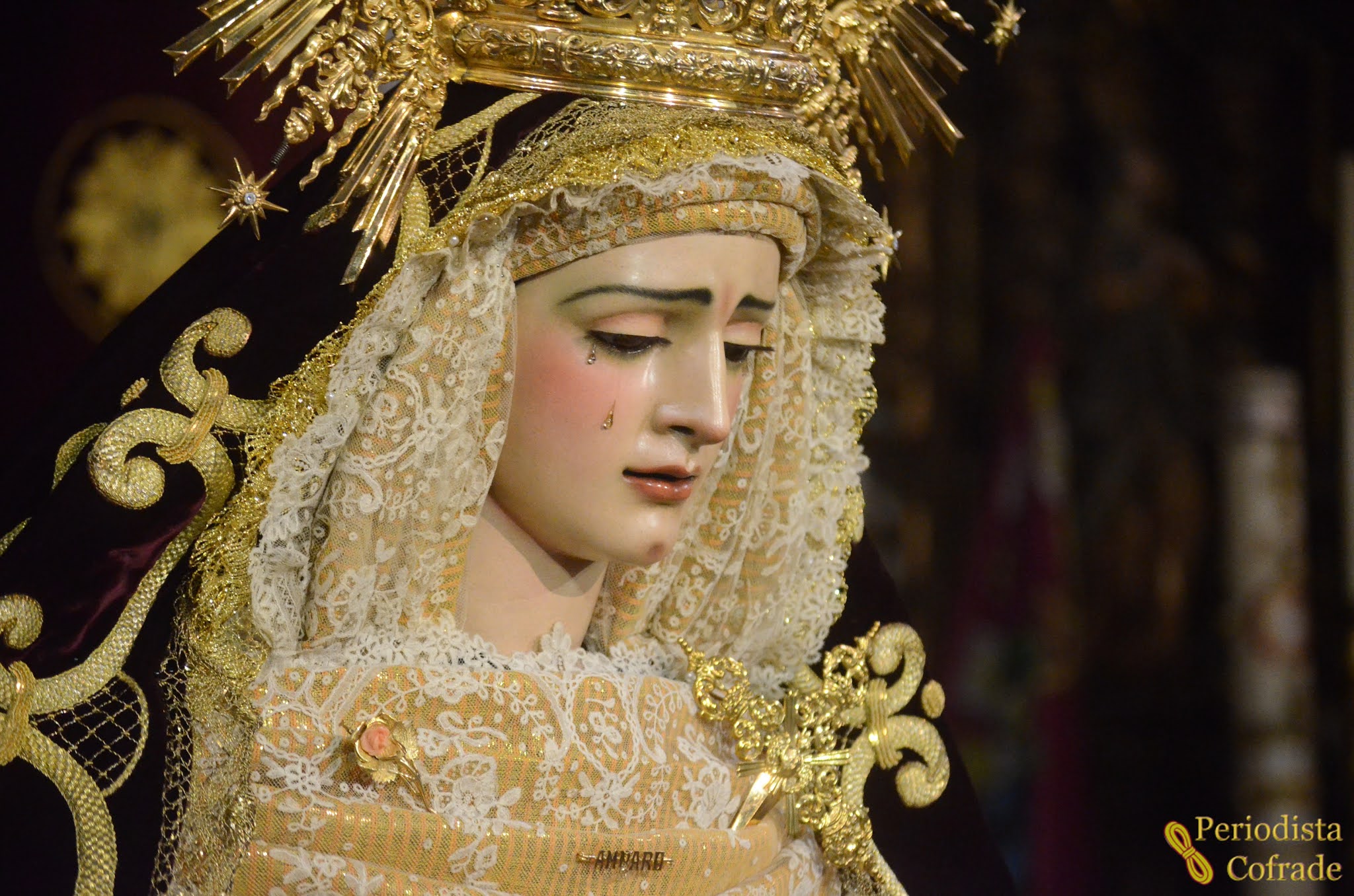 Asimismo, luce la corona de salida, mientras que en el pecherín cuenta con un puñal, un alfiler con la advocación Amparo, una pequeña cruz y un broche en forma de flor. A la altura del vientre tiene una medalla, mientras que con las manos sujeta un pañuelo de encaje en la derecha y una azucena de orfebrería dorada y dos rosarios en la izquierda.
