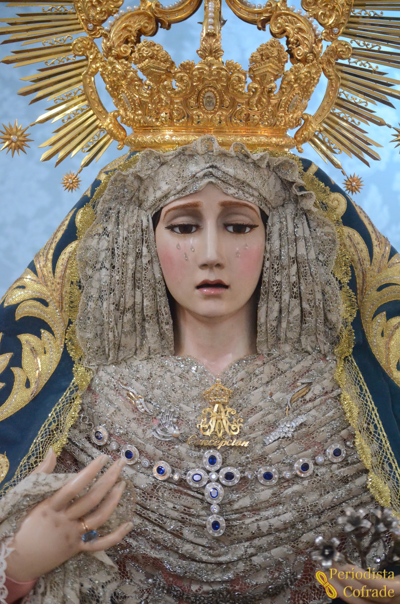 Sobre su peana procesional, en la que había una media luna y dos ángeles de orfebrería sosteniendo velas blancas, la Virgen de la Concepción se presentó a los devotos vestida con manto azul, saya rosa y fajín hebraico, y con su corona de salida. En el pecherín tenía varios broches, entre ellos uno con el anagrama mariano y una corona en su parte superior, además de la advocación de la imagen en letras doradas.