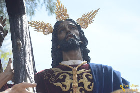 Sobre un alto monte de piedra salpicado de flores, con el cáliz a sus pies y una clámide en un lado, el Cristo de la Humildad y Paciencia discurre casi sin querer molestar, ensimismado y concentrado en el difícil momento que le toca vivir. El potente sol de la tarde parecía además cebarse con la dañadísima espalda del Señor.