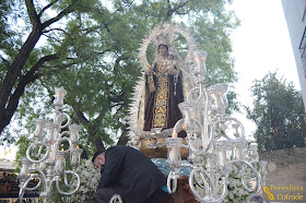 Las flores de la trasera fueron retiradas y las pequeñas andas de madera en las que iba la Virgen se soltaron del paso para ser empujadas hacia atrás y recogidas por varios miembros de la cuadrilla de costaleros.