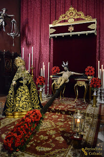 El pasado domingo tuvo lugar en la Parroquia de San Vicente el besapié al Santísimo Cristo de las Siete Palabras y besamanos a María Santísima de los Remedios. Ambas imágenes fueron situadas en el presbiterio alto del templo; la dolorosa junto al crucificado, aunque éste se encontraba tumbado, apoyado sobre dos cojines colocados en sendas mesas de madera dorada.