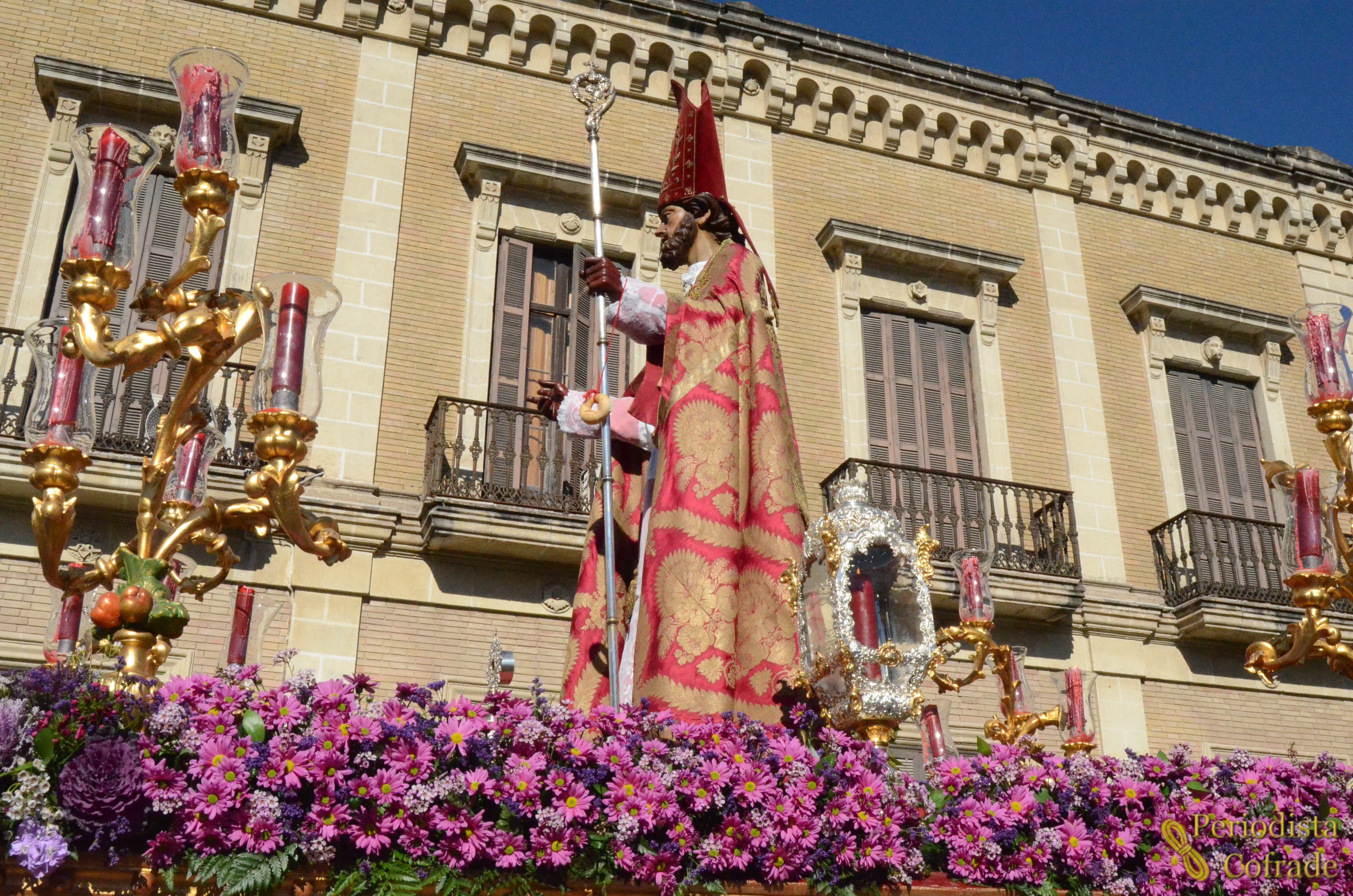 Tras el cuerpo de acólitos salió del templo San Blas sobre el que hasta 1939 fue el paso de Nuestro Padre y Señor de las Penas y que, tras haberse desprendido de él, la hermandad lo recuperó en 2007, le añadió unos respiraderos y lo utiliza desde 2009 para esta salida del patrón en el primer domingo de febrero.