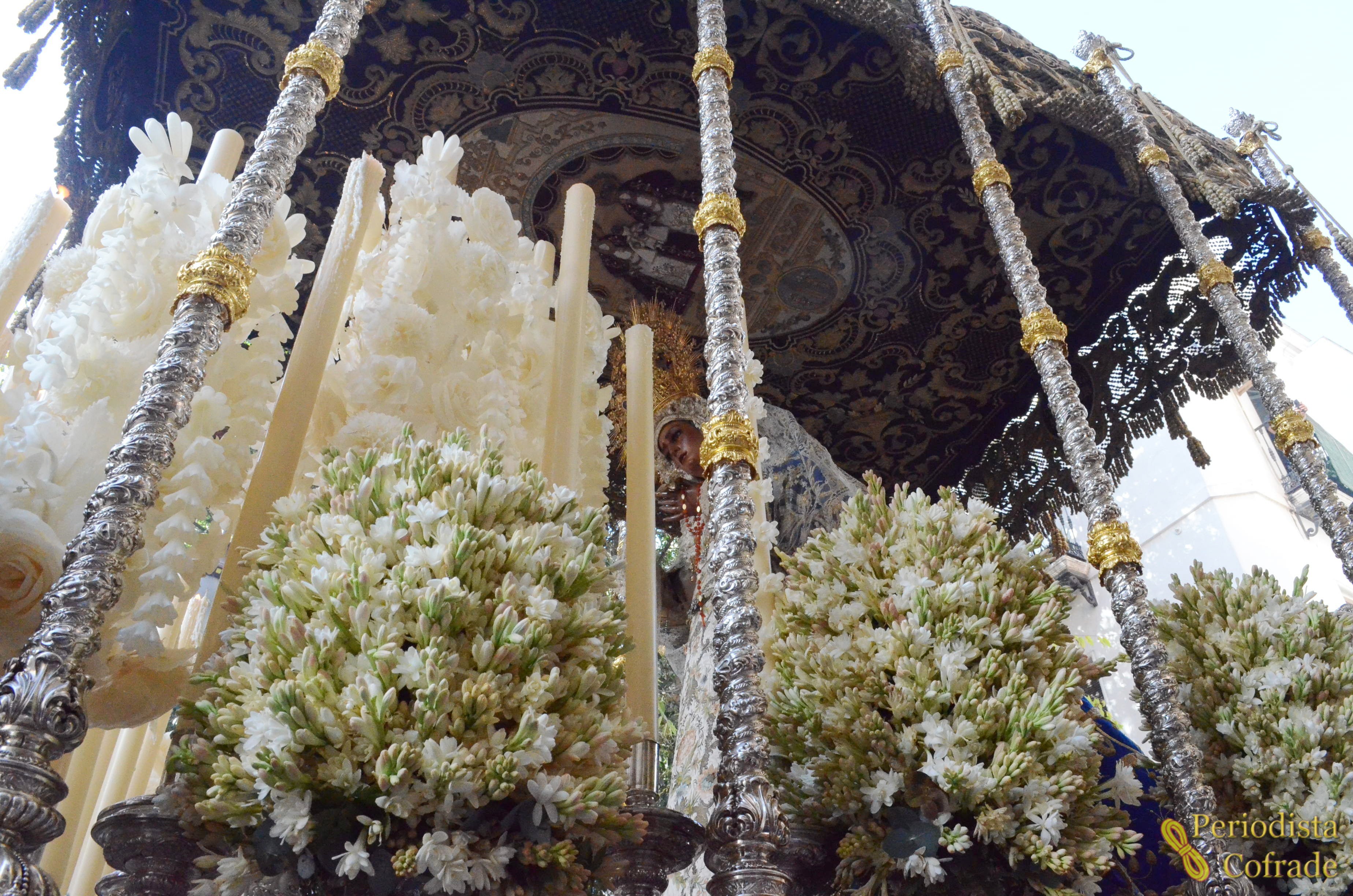 Pronto apareció el paso de palio de María Santísima de las Angustias, del que ya comentamos detalles relativos a la forma en que se presentaba la dolorosa para esta salida extraordinaria (ver). Cambió el exorno floral respecto a lo que podía verse días atrás con el paso completamente montado en el templo. Así, las jarras delanteras y el friso reprodujeron, como viene siendo habitual en los últimos años, el colorido de las flores bordadas en las caídas, con rosas, brunias, delphinium, jacintos y hojas doradas; mientras que las jarras laterales contaban con unos olorosos nardos y eucalipto.
