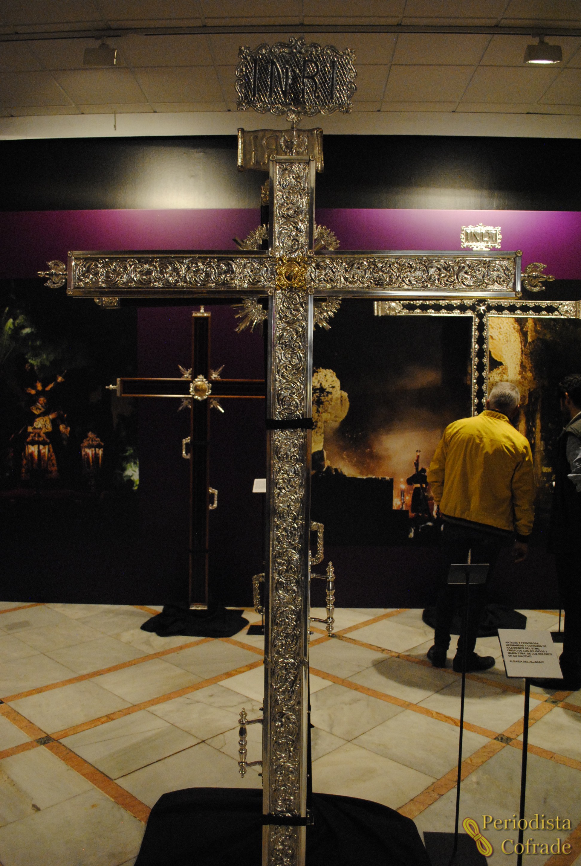 Para trasladarnos aún mejor al Vía Crucis del Aljarafe, la sala, que cuenta con una iluminación especial, se completa con grandes fotografías de este culto que tiene como escenario el Teatro Romano de Itálica.