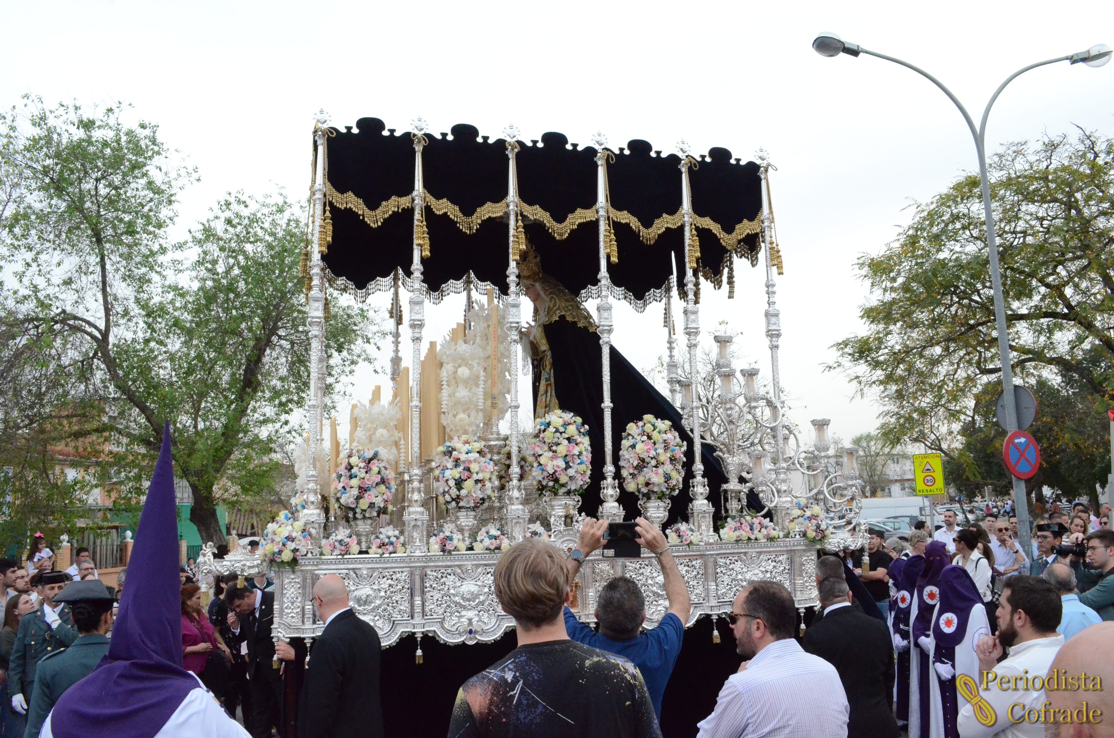 Más tarde, el paso de palio, adornado con rosas blancas y rosas, iris blancos, hypericum rosa, miniclaveles blancos, eringium azul, orquídeas blancas, algodón y flor de cera rosa, giró a la plaza del Platanero mientras los músicos tocaban "Virgen de la Estrella". Y tras una chicotá a tambor, la Virgen de los Dolores siguió rodeando la plaza en este inicio de su largo recorrido con la composición "Reina de San Antonio".