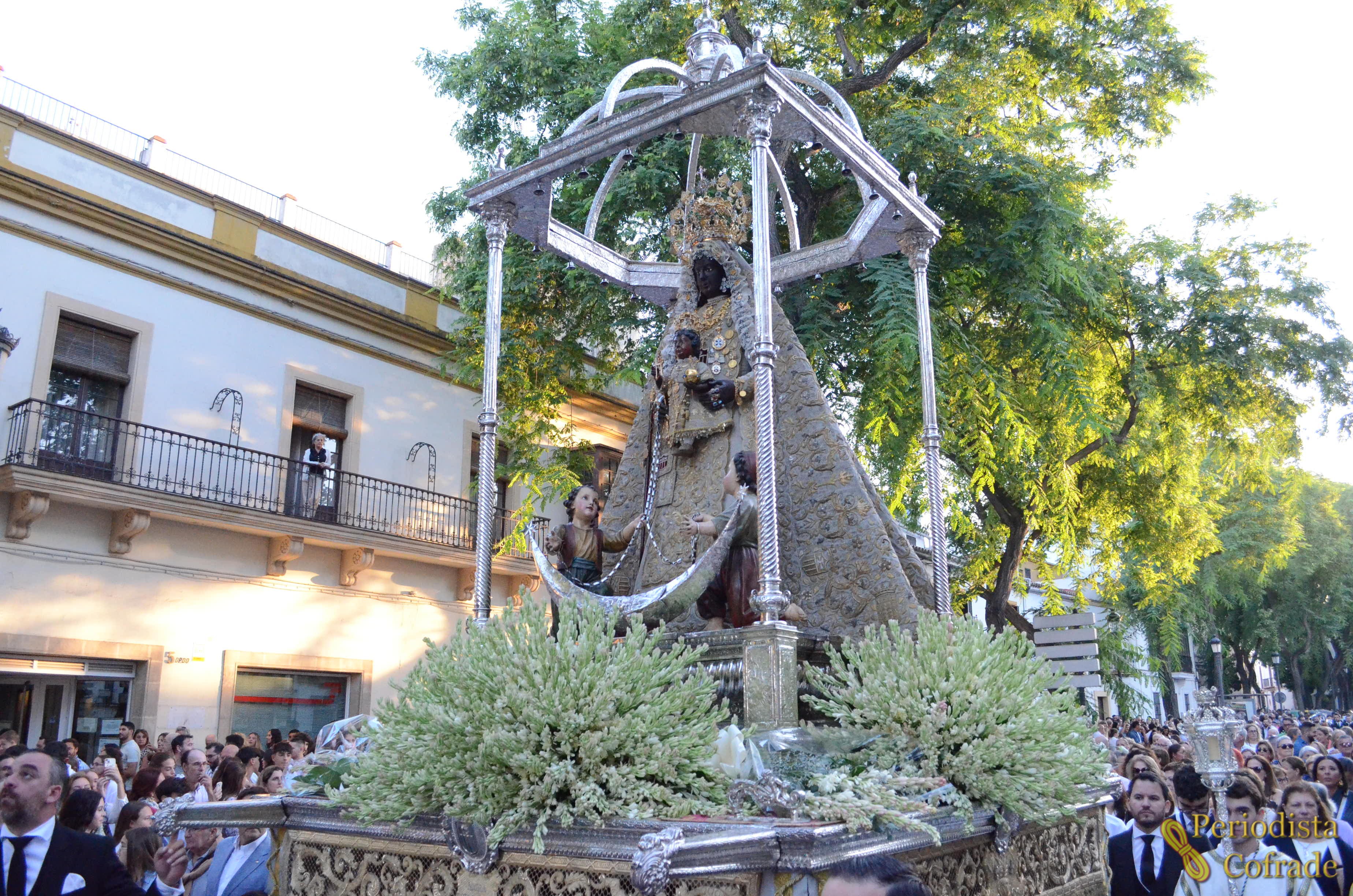 Seguidamente, volvió a tomar las riendas musicales la Banda de Santa Ana, que interpretó "Pasan los campanilleros" mientras el paso giraba ante la puerta de la Basílica y subía a la acera, donde se paró antes de entrar. Los costaleros se dieron la vuelta bajo las trabajaderas e instantes después levantaron a la Patrona, siempre a pulso, y procedieron a acercarla a su casa.