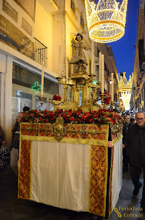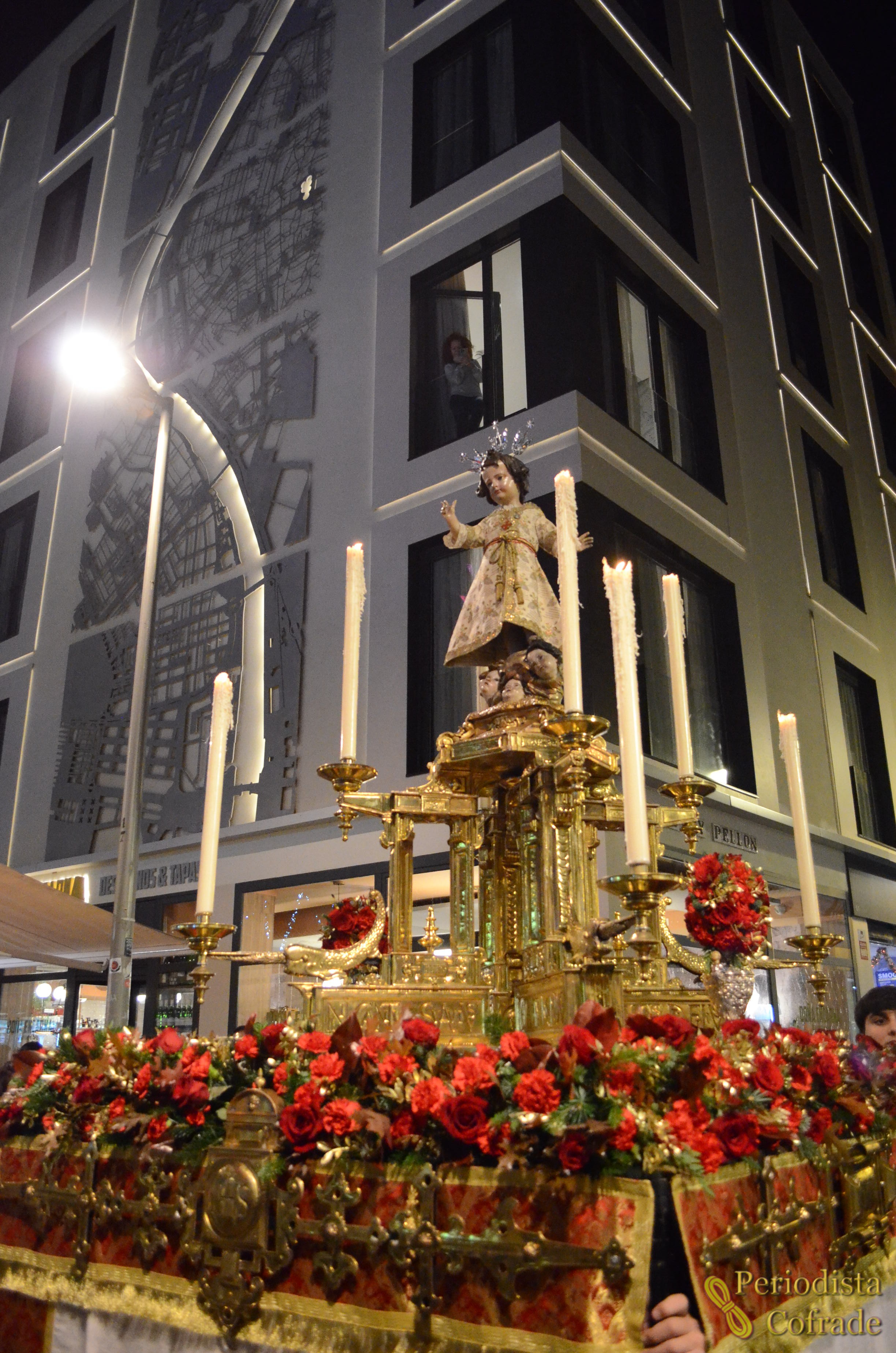 Pronto salió el paso, donde el Niño Jesús vestía una túnica de color crudo con decoración floral y lucía unas potencias de plata. Se elevaba sobre una alta peana dorada con ocho velas blancas. En cuanto al exorno floral, se componía de claveles y rosas de color rojo, además de hojas de helecho, romero y algunas otras doradas.