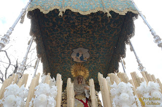 Y siguiendo al Señor del Prendimiento, su madre, María Santísima del Desamparo, entre claveles blancos y con la Banda Enrique Galán de Rota de nuevo tras ella. La combinación entre el rojo y el blanco predomina en todo en esta hermandad, no sólo en los nazarenos que obviamente no estaban este Domingo de Resurrección. El rojo del palio y el blanco de los claveles; el rojo del manto y el blanco de la saya; y también el blanco de la cera rizada, de la que pendían pequeñas cruces de Santiago de color rojo.
