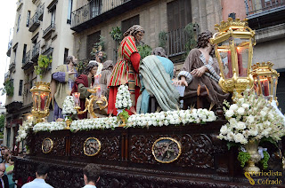 Desde Francos y Placentines, el misterio de la Sagrada Cena bajó la Cuesta del Bacalao hasta la calle Alemanes, y luego continuó a Cardenal Carlos Amigo, donde a eso de las ocho de la mañana ocupó su lugar para la procesión que estaba a punto de salir.
