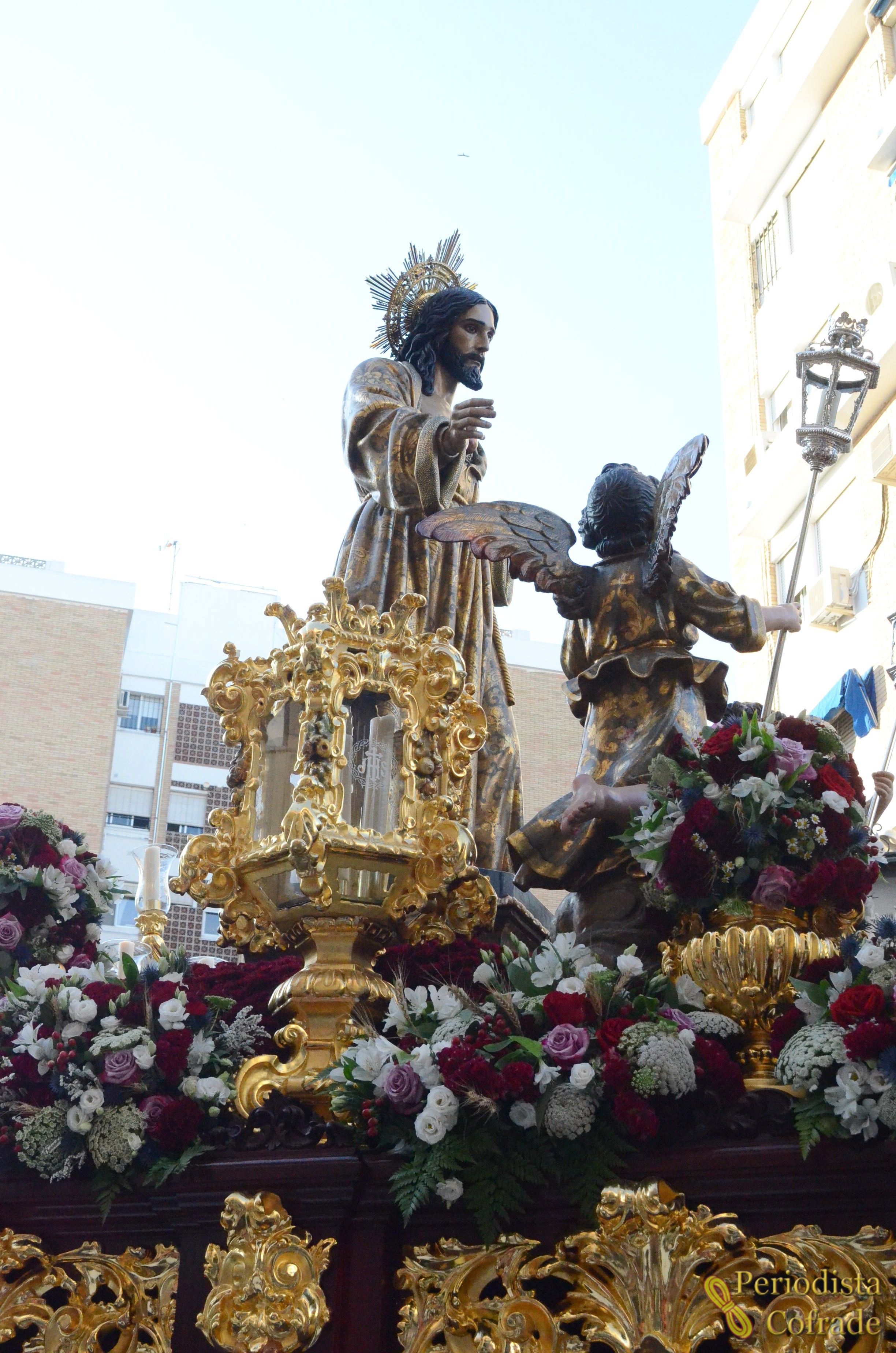 Pronto, a las órdenes de los Villanueva, el paso recorrió el centro de la única nave del templo desde el presbiterio hasta la puerta, en la que se detuvo antes de realizar la salida. El paso contaba con un exorno floral de muy variadas especies y tonalidades; algo muy característico de este paso, aunque el año pasado se optó por un único color blanco.